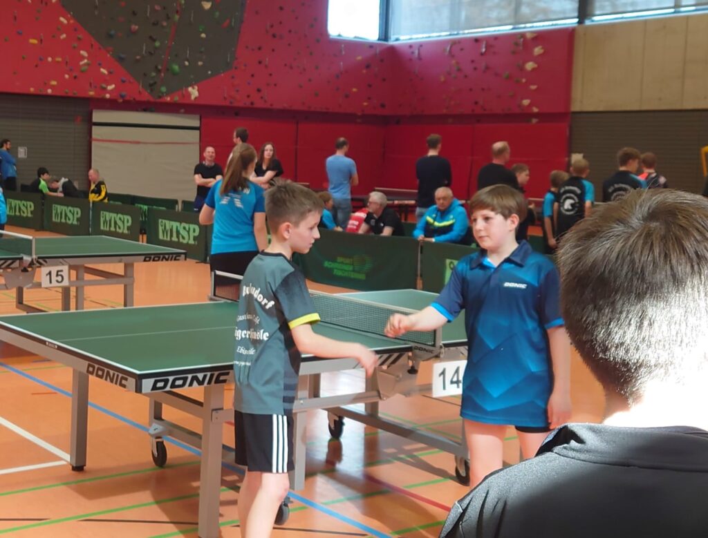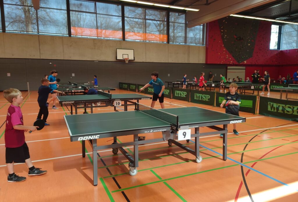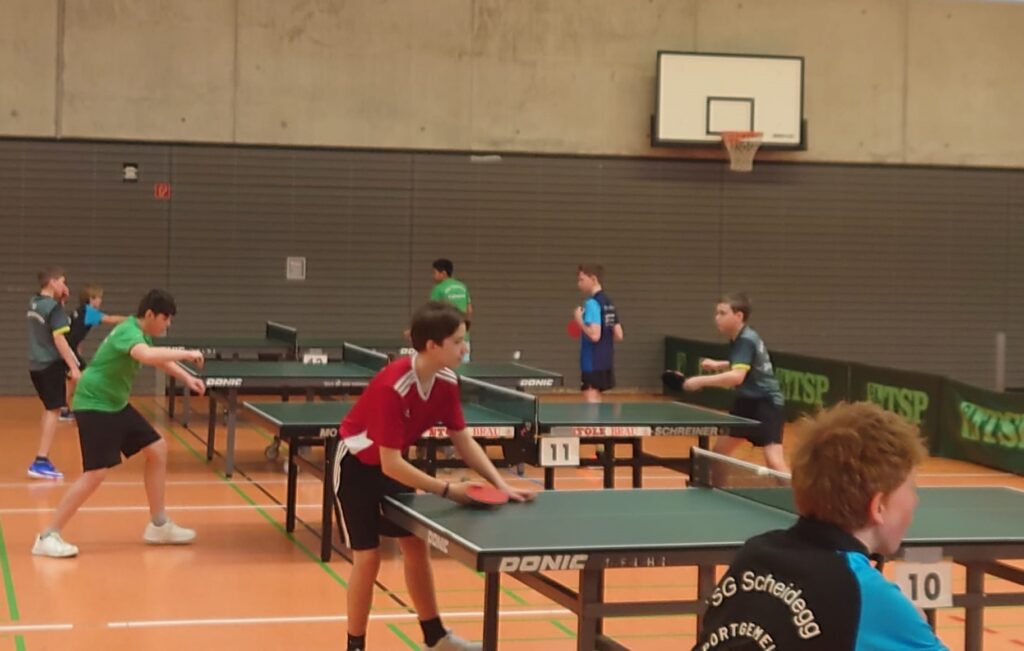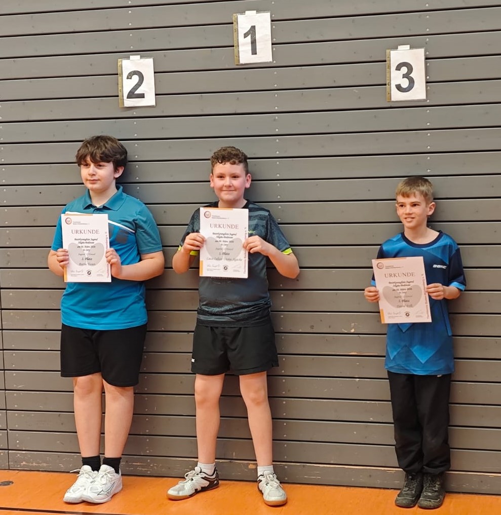 Bei den Jungen U12 musste man Luca Utoiu-Agache sicherlich zu den Mitfavoriten rechnen. Er marschierte jedoch mit einer glänzenden Spielweise ganz souverän durch das Turnier und wurde am Ende mit Platz 1 belohnt. Echt starker Auftritt. Luis Manz bei den U15 war vornominiert und sorgte im Laufe des Turniers für ein noch nie erlebtes Novum. Souverän gewann er die Gruppe mit 5:0 Siegen und 15:1 Sätzen. In der Endrunde schwanden dann langsam die Kräfte, am Ende hatte er wie noch zwei weitere Spieler 3:2 Siege und auch die Satzdifferenz aller Drei war gleich. Mit ganzen 2 mehr gewonnenen Bällen gewann er somit hauchdünn Platz 2 und die Qualifikation. Spannender geht es nicht mehr. Bei den Jungen U11 spielte Vincent Kaiser ein starkes Turnier, mit 2:3 Siegen in der Gruppe erreichte er Rang 9, Nils Gußmann wusste ebenfalls zu gefallen. Mit 1:8 Siegen landete er auf Platz 9, was seinen Trainingsfleiß sicherlich noch weiter anstacheln wird. Damian Look (U13) scheiterte mit 2:3 Siegen nur knapp am Einzug in die Endrunde und wurde 7.er, eine Fünfsatzniederlage verhinderte eine noch bessere Platzierung.
